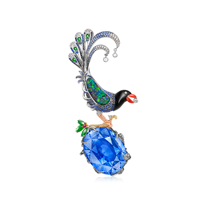 ▲101.88CT無燒藍寶喜鵲胸針 (現侏儸紀自然科學博物館典藏)